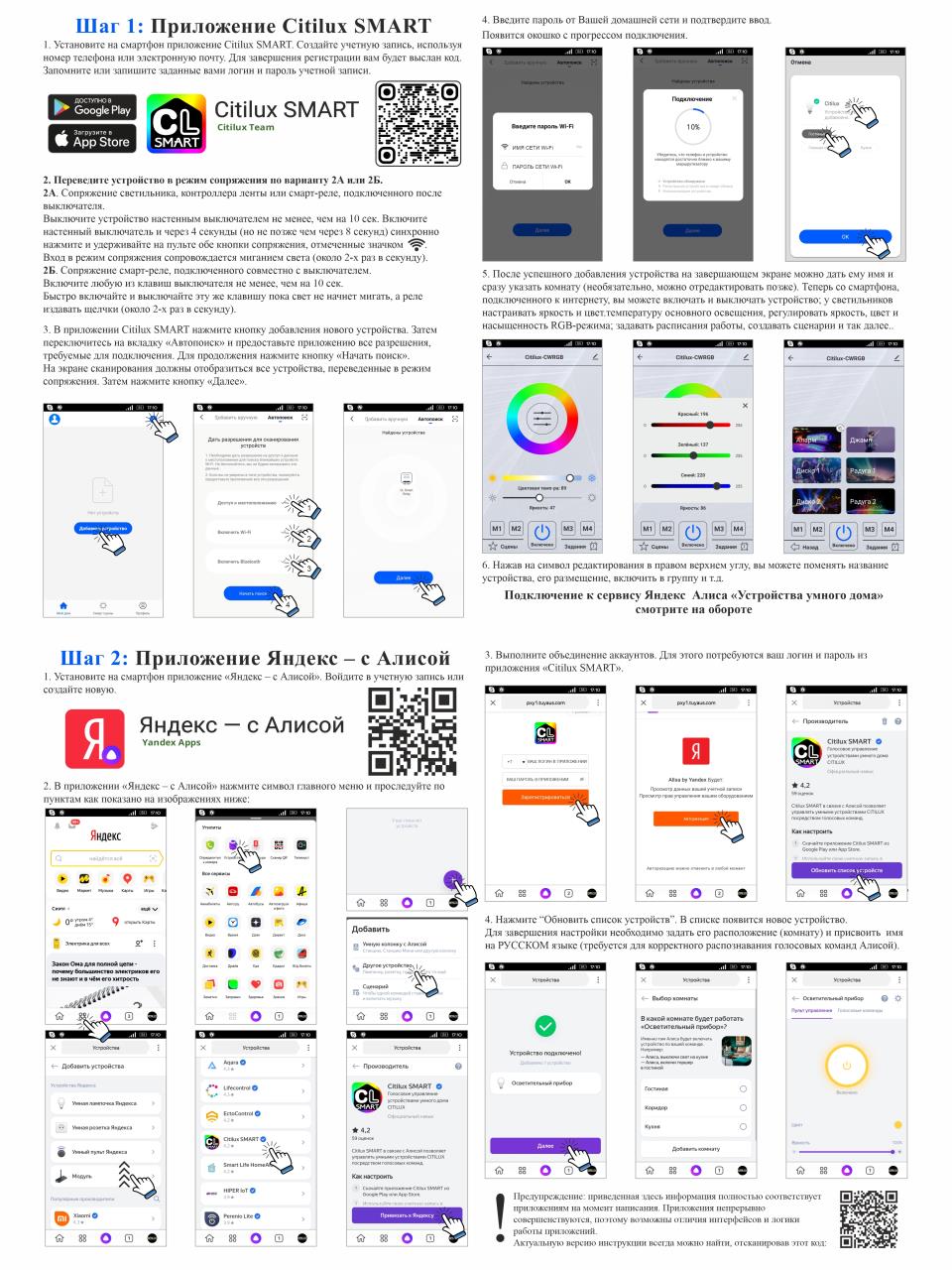 Умная люстра Citilux Старлайт Смарт CL703A30G нового поколения с голосовым управлением Люстры коллекции Старлайт давно закрепили за собой звание самых популярных потолочных светодиодных светильников в России. Оригинальный дизайн, максимальная компактность, широчайший функционал, доступная цена, и это далеко не полный перечень достоинств устройств серии Старлайт. Однако время не стоит на месте и усилиями наших инженеров модели постоянно совершенствуются. Если когда-то вы удивлялись тому, что люстре можно отдавать команды при помощи пульта дистанционного управления, то теперь мы представляем новейшие модели, с практически неограниченными возможностями. Светильником CL703A30G коллекции Старлайт Смарт вы сможете управлять не только при помощи обычного клавишного выключателя и пульта ду, но и фирменного мобильного приложения, доступного на операционных системах IOS и Android, а также просто голосом. Особенности работы с помощью голосового управления Модель работает с самыми популярными в России голосовыми помощниками Алиса и Маруся, также доступно управление с помощью Siri, путем назначения голосовых команд для индивидуальных сценариев. Благодаря этой функции вы получаете уникальную возможность контролировать освещение в квартире, загородном доме или на даче, из любой точки мира, через сеть интернет, при помощи обычного мобильного устройства. Приложение на русском языке, разработанное программистами нашей компании, поможет вам буквально в несколько шагов синхронизировать светильники с вашим мобильным устройством, при этом у вас будет возможность управлять всеми световыми приборами на вашей территории, как синхронно, так и независимо в каждом помещении. Усовершенствованный пульт дистанционного управления Потолочный светильник CL703A30G комплектуется пультом управления новейшего поколения, получившим вдвое больше функционала, за счет реагирования на длинные и короткие нажатия клавиш. Также мы добавили на пульт 4 канала, на которые возможно привязывать не ограниченное количество умных люстр нашего производства, и управлять всеми устройствами синхронно, или по отдельности, любым выбранным каналом. Функционал каждой клавиши можно изучить, просто считав QR-код на задней крышке самого пульта камерой Вашего смартфона. Удобное управление обычным настенным выключателем Традиционно наш светильник снабжен удобнейшим управлением с помощью обычного настенного выключателя, никакой специализированный приобретать и устанавливать не требуется. С выключателя будут срабатывать режимы, которые предварительно запрограммированы на кнопки памяти от М1 до М4 пульта управления. При первом включении, если вы долго отсутствовали дома, всегда включится режим сохраненный на кнопке М1, если светильник выключить настенным выключателем и в течении 5 секунд включить обратно, сработает режим с клавиши М2. Последующие аналогичные циклы переберут оставшиеся сохраненные режимы. Citilux Smart – прорыв в области умного освещения