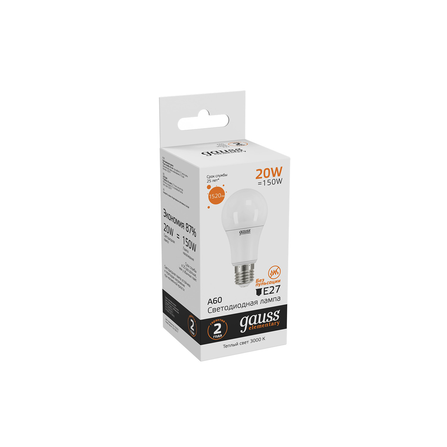 Лампа Gauss Elementary A60 дарит вам качественное и сочное освещение с солидной яркостью. Теплая цветовая температура 3000К комфортна и привычна для наших глаз, способствует продуктивной работе с документами без переутомления. Дополнительным плюсом современных технологий является отсутствие пульсаций. Лампа прекрасно подойдет для использования в любом помещении – от домашнего кабинета до приветливого холла.