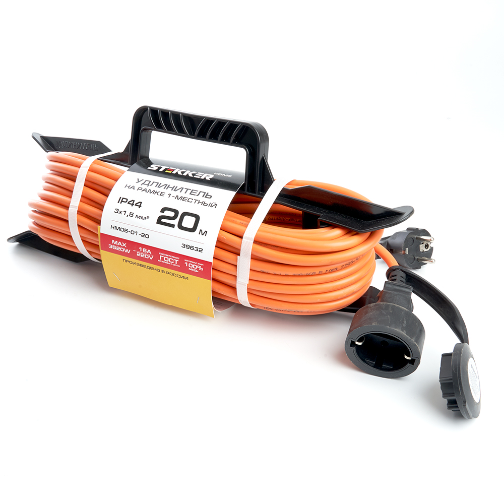 Удлинители STEKKER HM05-01-20, серия Home, цвет оранжевый, длина 20 м, количество розеток 1, латунь, сечение кабеля 1.5 мм2, тип кабеля ПВС, материал кабеля медь, ток 16А, напряжение 220В, максимальная нагрузка 3520Вт, тип вилки - угловая. Диапазон рабочих температур +1..+35°C, степень защиты IP44, класс защиты от поражения эл. током 1, размеры изделия 380*140*135. Гарантия 2 года.