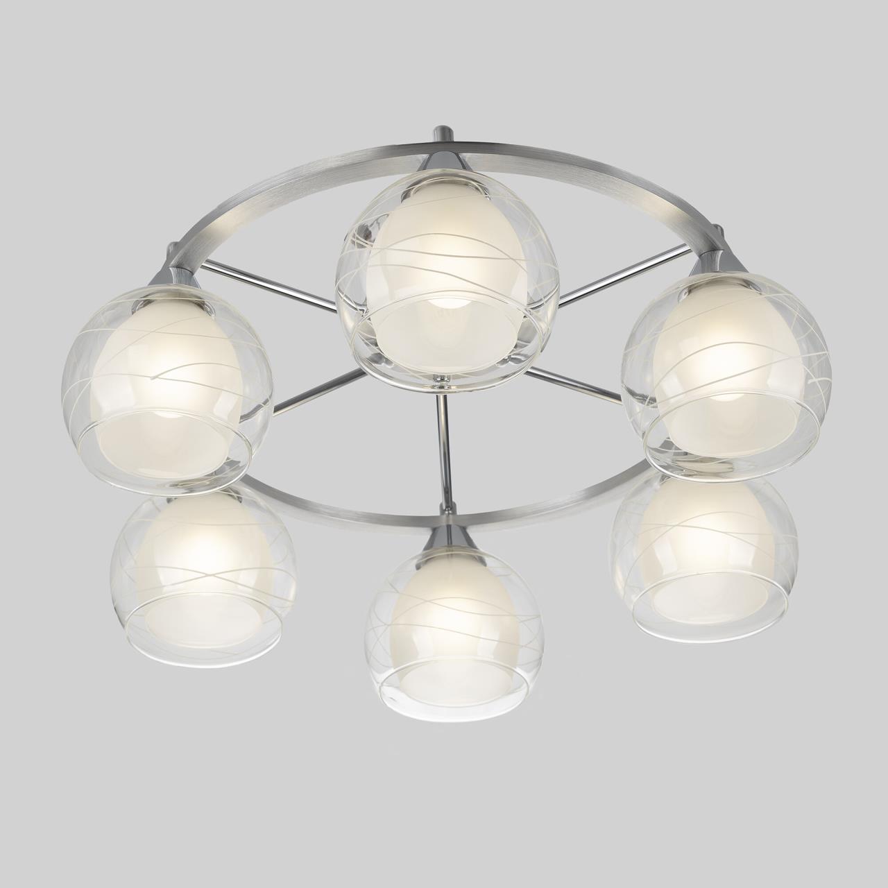 Потолочные светильники серии «Буги» выделяется интересным дизайном в стиле модерн. Люстры сделаны из легкого метала и интересными стеклянными двойными плафонами. Внешняя сторона плафона прозрачная с дизайнерским узором, а внутренняя полупрозрачная. За счёт полупрозрачного плафона свет в помещении получается очень яркий, равномерно рассеянный, но вместе с тем мягкий, приятный для зрения. Арматура модели на шесть рожков с завода в упаковке собрана и скоммутирована на двойной выключатель. Деление осуществлено 4х2, с одной клавиши будет включаться четыре плафона, со второй ещё два. Подключение произведено через один плафон. Люстры производятся в двух цветах: белый плюс хром, идеальное решение для нежных и светлых интерьеров, и алюминий плюс хром, который лучше сочетается с современными дизайнами. Арматура слегка вытянута, не идеальный круг. Такое конструктивное решение позволяет достигать хороших показателей освещённости по углам комнаты. Крепятся люстры под потолком тем самым они не занимают место и прекрасно подходят к помещениям с небольшой высотой потолка. Патроны выполнены из термостойких материалов, выдерживают лампы накаливания до 75 ватт включительно, а энергосберегающие, или светодиодные лампы можно использовать любой яркости, что позволит вам осветить большие площади. Площадь освещения моделей на четыре рожка до 21 квадратного метра.