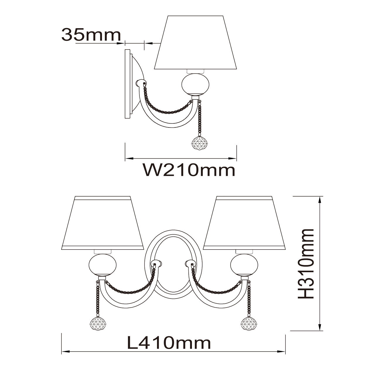 Основание светильника выполнено из металла и гальванизировано в цвет хрома. Рожки выполнены по технологии проката на роликовом станке. Розетки выполнены из прозрачного акрила  в виде  шара.                                                                  Двойные плафоны: выполнены из органзы графитового цвета, с атласным кантом серого цвета и с термостойким акрилом с внутренней стороны, прошиты.Декор: цепочки гальванизированы в цвет арматуры, подвески декорированы прозрачными хрустальными шарами.