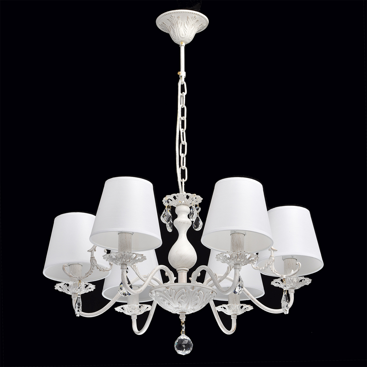 Элегантная и нежная люстра из коллекции «Виталина» придется по душе даже самым искушенным эстетам. В ней всё гармонично: металлическое основание матового белого цвета дополнено эффектом патины в цвет золота, плавно изогнутые рожки и ажурные розетки подчеркнуты лёгкими тканевыми абажурами белого цвета с сатиновой фактурой. Ещё более эффектной делают люстру декоративные хрустальные подвесы, которые создают мягкие переливы.