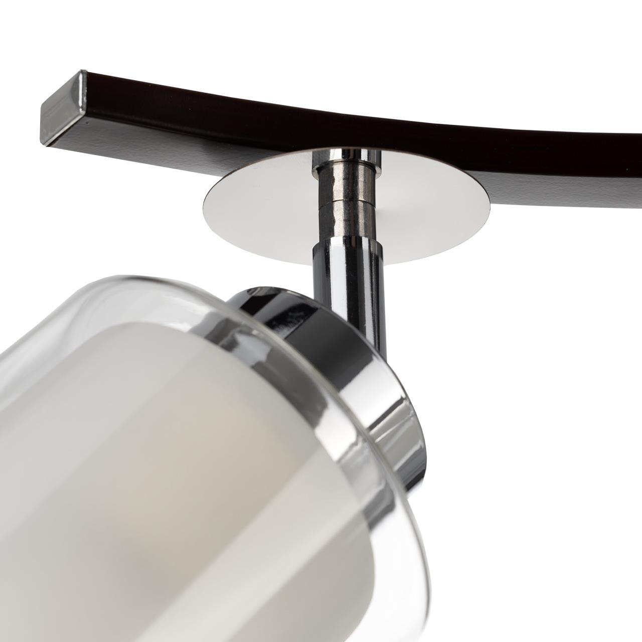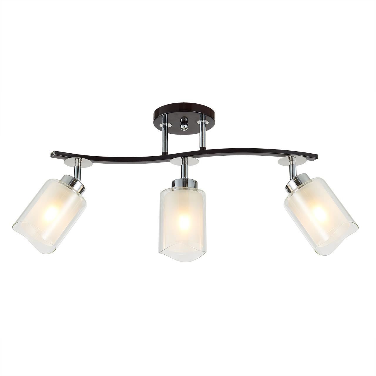 Потолочный светильник коллекции Фортуна на 3 рожка выполнен в цвете венге с декоративными хромовыми элементами. Плафоны оснащены поворотным механизмом, что позволяет зафиксировать их в любом положении. Это технологическое решение даёт возможность изменить дизайн светильника, а также оптимально распределить освещение в помещении. Цоколь патрона Е27 с ограничением по мощности для ламп накаливания до 75 ватт, светодиодные лампочки можно ставить любой мощности. Плафоны выполнены из стекла, наружное прозрачное, а внутреннее белое матовое. Каркас люстры сделан из металла. Площадь освещения до 11 квадратных метров. Тип крепежа: потолочный. Размер: Длинна: 56,5 см, Высота: 25 – 33 см, Ширина: 13 см.